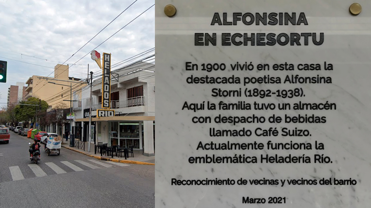 Hoy, ese paso por el barrio está señalado en el territorio. Una placa conmemorativa recuerda su presencia en la ciudad en la esquina de Mendoza y Constitución, barrio Echesortu (Mendoza al 3600), lugar donde funcionó el antiguo Almacén–Café Suizo de la familia Storni, y la inscribe de manera concreta en la memoria urbana. No es una estatua ni un monumento lejano: es una marca que señala una casa, una dirección, una vida posible.