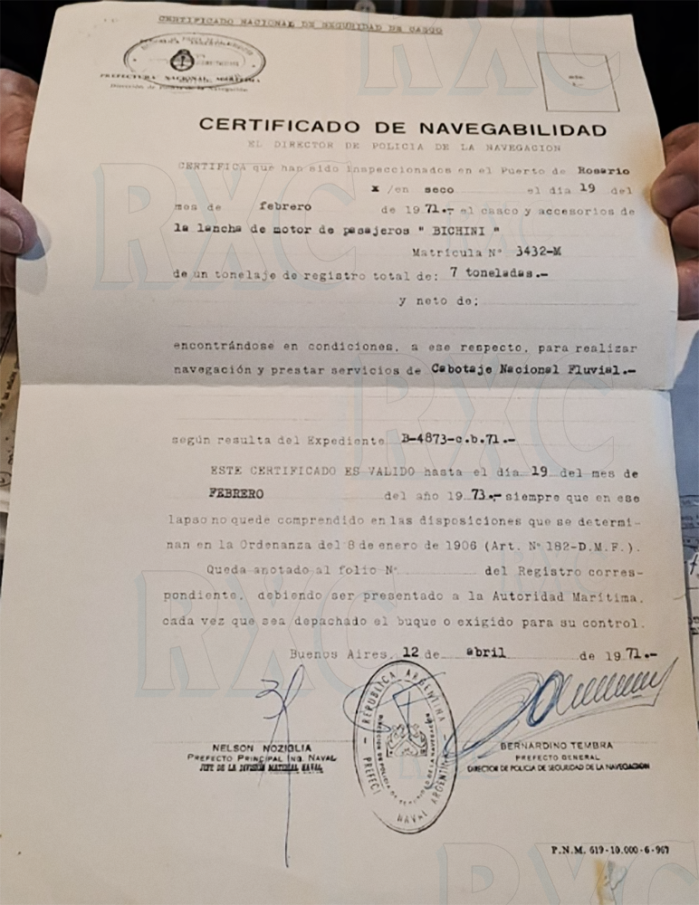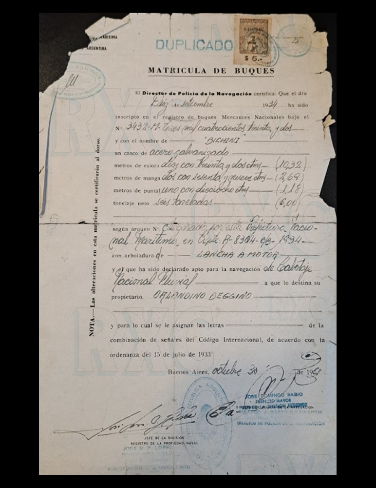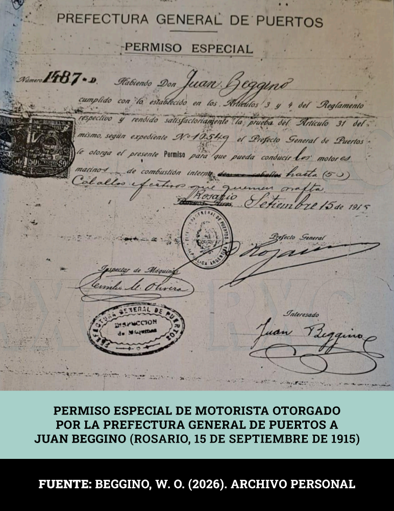 Juan Beggino falleció en 1914, un año antes de la emisión de su certificado de motorista por parte de la Prefectura General de Puertos (1915). Este desfasaje temporal introduce una particularidad en la trayectoria documentada del propietario de la embarcación: la acreditación formal de una práctica que ya ejercía en vida se produjo de manera póstuma, evidenciando las dinámicas administrativas de la época y la frecuente distancia entre el ejercicio efectivo de un oficio y su reconocimiento institucional.