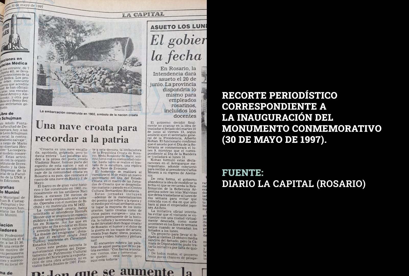 Los recortes periodísticos permiten reconstruir ese proceso: en mayo de 1997, durante las celebraciones del Día del Estado croata, se formalizó su emplazamiento. La prensa destacó tanto su valor histórico como su condición de testimonio material del desarrollo portuario rosarino, y registró la participación de autoridades diplomáticas junto al entonces intendente Hermes Binner.
