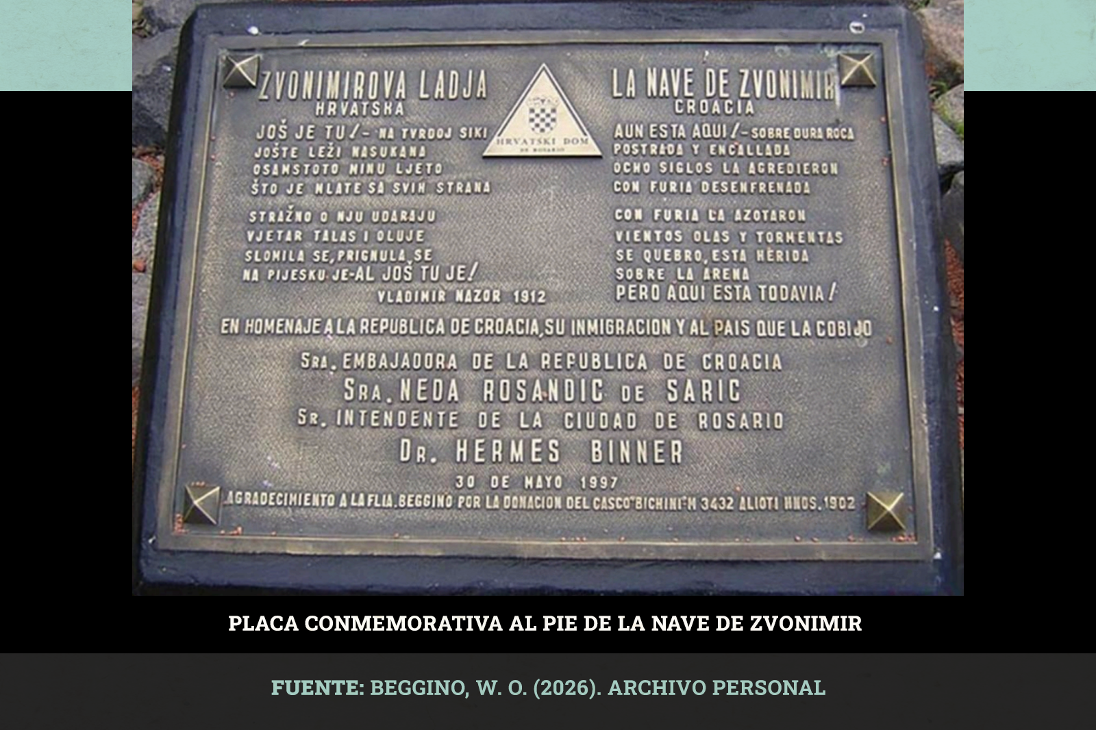 La denominación “La Nave de Zvonimir” remite, además, a “Dmitar Zvonimir”, figura representativa de la tradición histórica croata, evocada como símbolo de identidad nacional. De este modo, el monumento se ha consolidado, con el tiempo, como un símbolo que articula distintas capas de sentido al conjugar la historia de una familia inmigrante italiana, la memoria del trabajo fluvial rosarino y la experiencia migratoria croata —atravesada por desplazamientos, conflictos y procesos de reconstrucción identitaria—, enlazando trayectorias de diversos orígenes, que encontraron en nuestra ciudad un espacio para su inserción social, laboral y cultural.