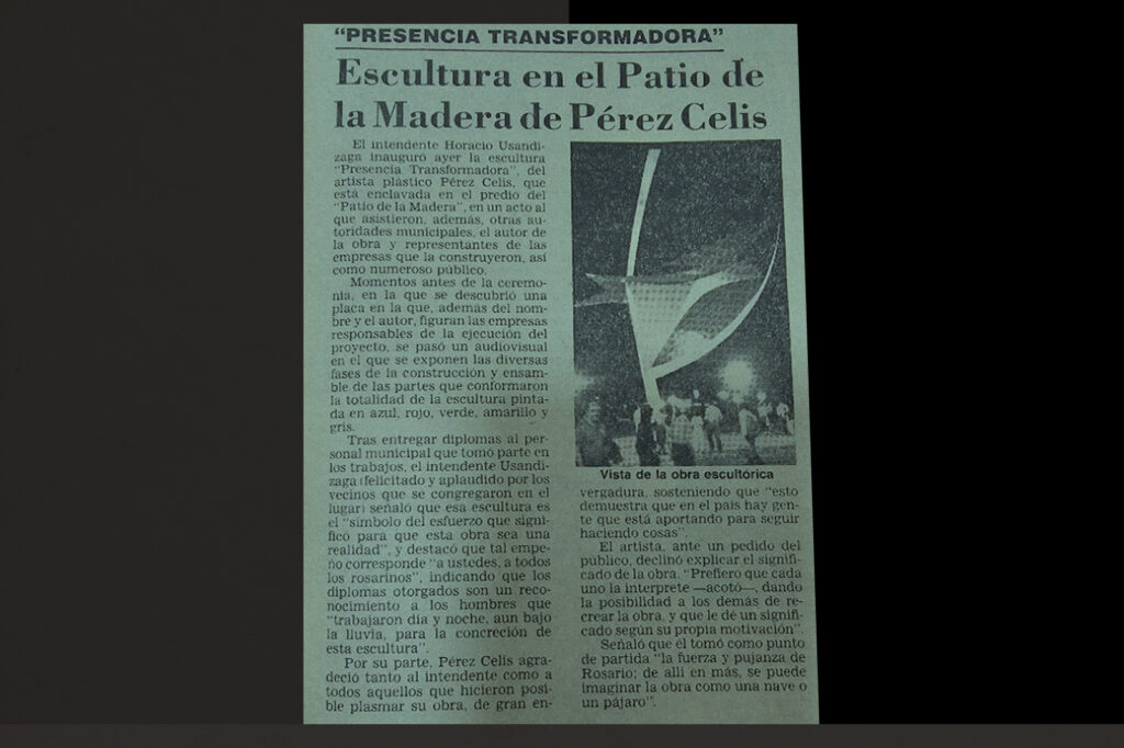 En medio de este clima de celebración, el 7 de octubre de 1988 se reveló el corazón artístico del predio: la escultura “Presencia Transformadora”. La obra, de hierro y chapa de 14 metros de altura, fue creada por el prestigioso artista plástico Pérez Celis, quien trabajó sobre una maqueta original aplicando una paleta vibrante de rojo, amarillo, blanco, azul y verde.